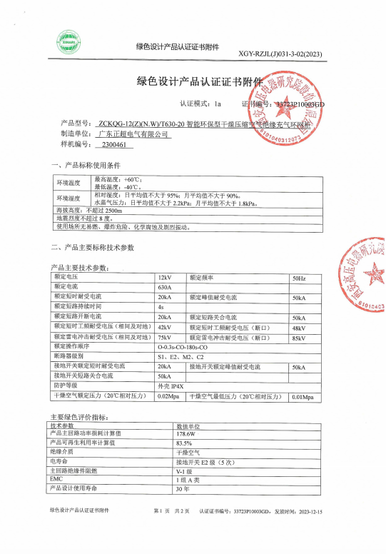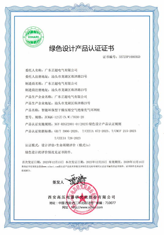 公司研发的环保气体柜,已委托行业归口管理部门西安高压电器研究院,依据国内首份高压开关评价标准T/CMIF215-2023/T/CEEIA 726-2023《绿色设计产品评价技术规范中压气体绝缘金属封闭开关设备和控制设备》,对环网柜开展“绿色设计产品评价”。这份双编号标准由机械工业联合会与电器工业协会发布,且由西高院负责起草,它填补了高压开关设备绿色评价领域的空白。