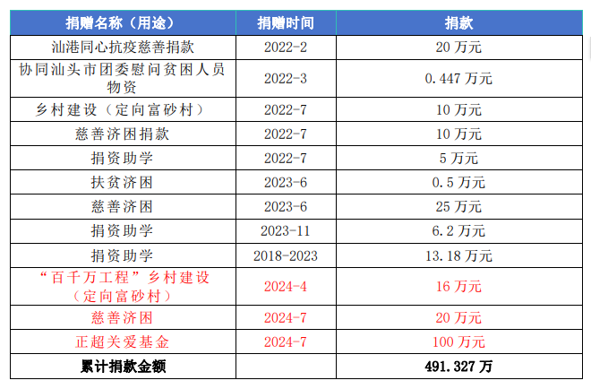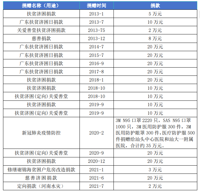 公司在注重自身发展的同时,积极承担社会责任,热心公益事业,主动参与各阶层、各组织的公益活动,多次获得表彰。十多年连续参加“广东扶贫济困日捐款”。近年来在在河南水灾、新冠肺炎疫情中捐款捐物,受到表彰。